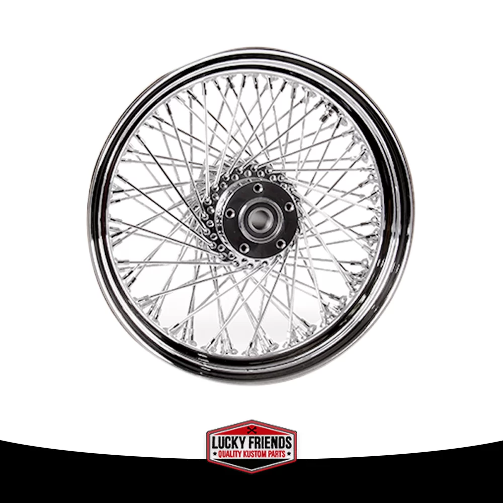 RODA DIANTEIRA 16″ X 3.5″ – 80 RAIOS / EIXO 1″ – DISCO DUPLO / CROMADA / CUBO 170mm / TOURING
